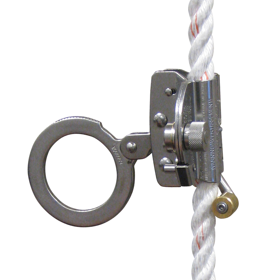 Elaborado en acero inoxidable de alta resistencia. Es portátil y de fácil instalación ya que posee un sistema de apertura que permite instalarlo en cualquier punto de la línea de vida, además incluye seguro de apertura para evitar que el sistema se abra y se desensamble y seguro de activación que evita que el usuario active por accidente el dispositivo y evite que cumpla su función.