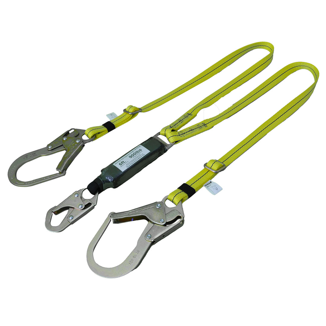 Eslinga plana de doble terminal (tipo y) regulable con paquete de absorbedor de energía, dos ganchos grandes en acero de 2 1/4 de apertura y un gancho pequeño de 3/4,