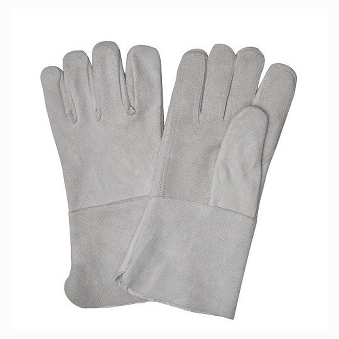 Guante corto, reforzado en la palmas con parche de cuero, uso rudo, fabricado en carnaza de res, con bies color gris.